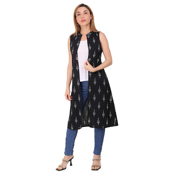 Floral Printed Sleeveless Black Kimono Style Cotton Women Long Shrug